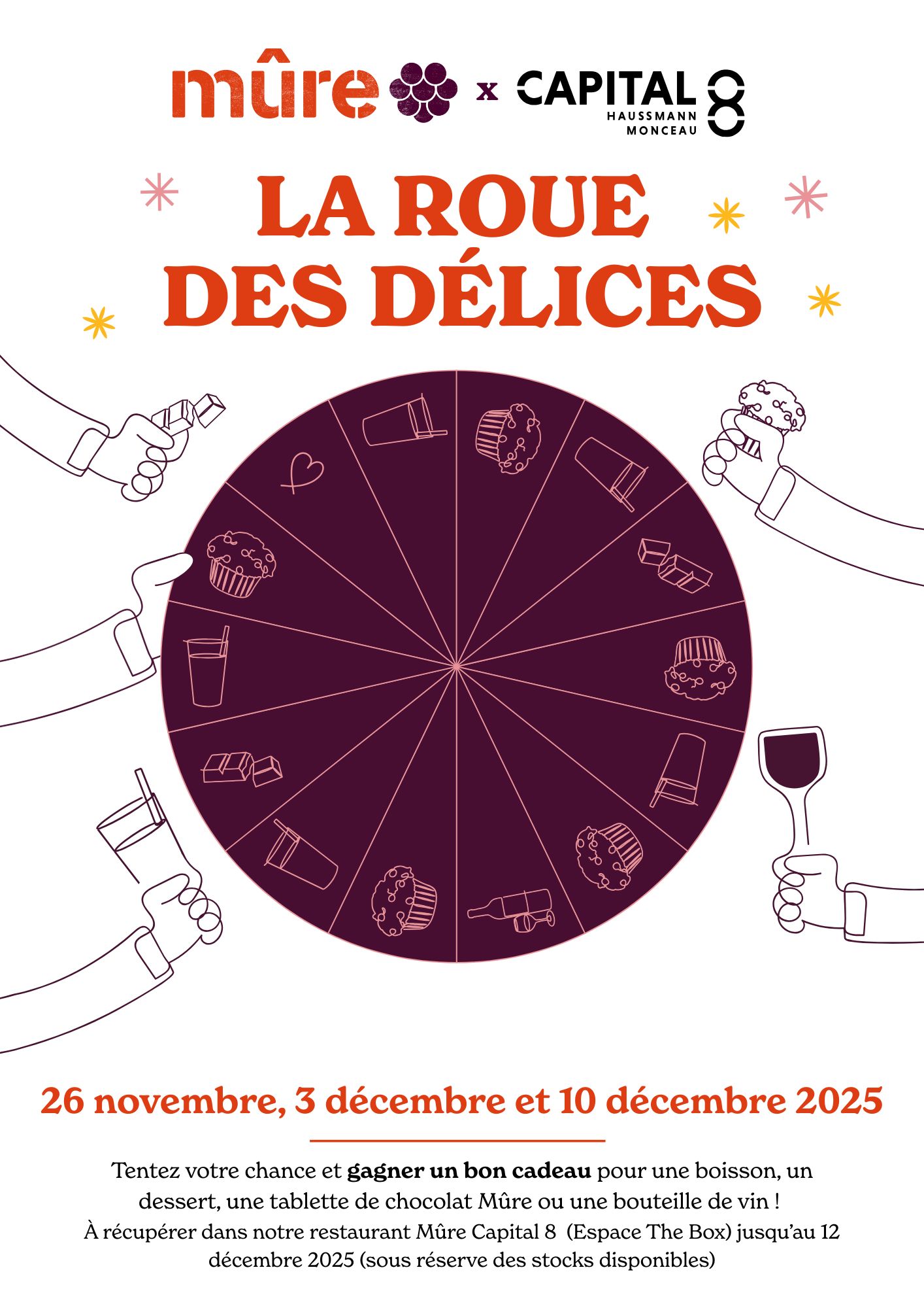 Cette année, Mûre vous propose de tenter votre chance à leur roue de la fortune… oui, vraiment ! Elle regorge de cadeaux gourmands et festifs à gagner : De délicieux chocolats